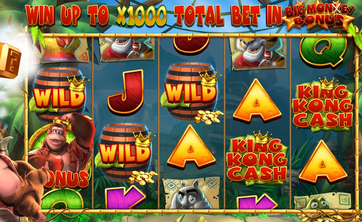 The Big Monkey Bonus is the highest-paying feature in King Kong Cash, offering the chance to win up to 1,000x your stake. In this round, King Kong sits at the center of a carousel of spinning barrels, each containing different multiplier values. The barrel you land on determines your prize. After each spin, you pick bananas that can either grant you another spin or end the bonus with a bomb. The feature continues until you hit a bomb, and the total of your multipliers is awarded. The Big Monkey Bonus is the ultimate goal for many players, combining suspense, big win potential, and interactive gameplay for a truly memorable finish.